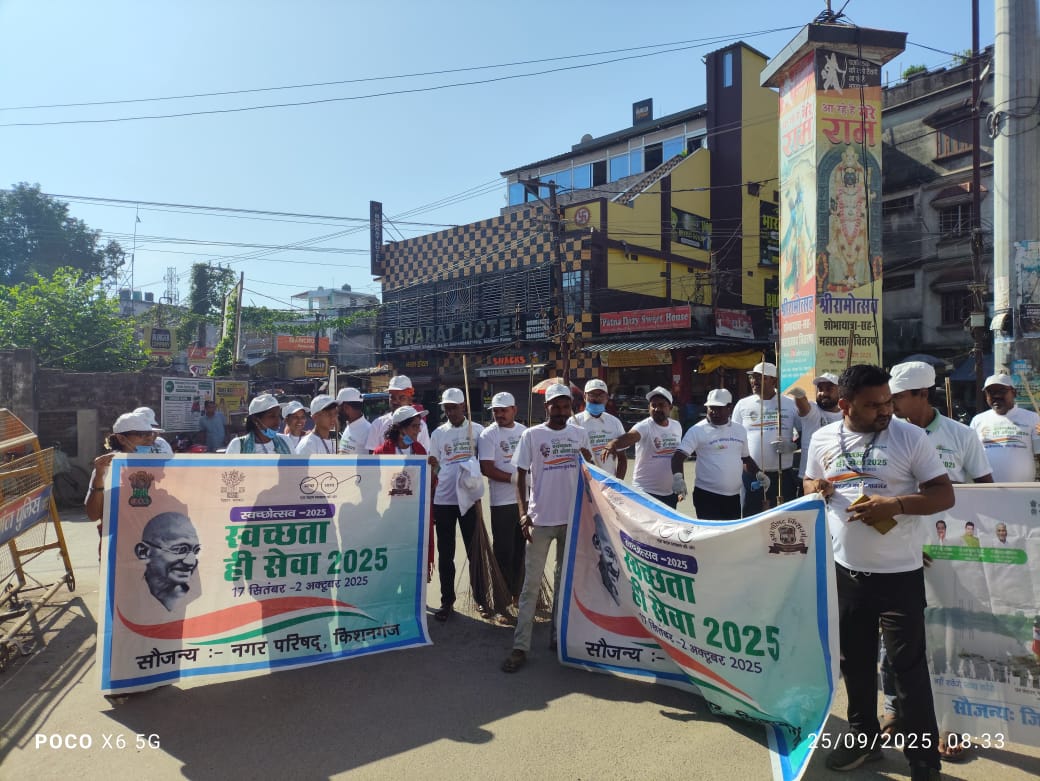 अवासन एवं शहरी कार्य मंत्रालय तथा, जल शक्ति मंत्रालय, भारत सरकार एवं नगर विकास एवं आवास विभाग बिहार पटना के निर्देश के आलोक में नगर परिषद किशनगंज के द्वारा शहर के गांधी चौक में स्वच्छता ही सेवा कार्यक्रम अंतर्गत एक दिन एक घंटा एक साथ श्रमदान के तहत स्वच्छता अभियान चलाया गया।