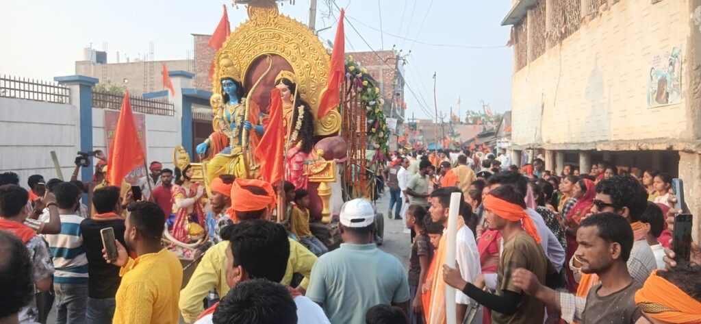 मनिहारी /कटिहार – नगर पंचायत क्षेत्र में गुरुवार को भव्य शोभा यात्रा निकाली गई। जिसमें हजारों की संख्या में रामभक्तों ने बढ़-चढ़कर हिस्सा लिया। पूरा शहर जय श्रीराम के नारों से गूंज उठा और वातावरण पूरी तरह भक्तिमय हो गया।शोभा यात्रा की शुरुआत स्थानीय हाई स्कूल उच्च विद्यालय परिसर से हुई।