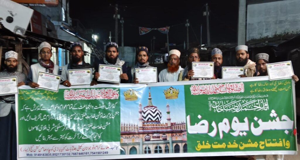 उन्होंने मुसलमानों की रहनुमाई कर इमान को पुख्ता किया है। इस अवसर पर जश्न ए यौमे रजा व इफ्तेताह खिदमत ए खल्क किशनगंज का पुनर्गठन किया गया।मुफ्ती मक्की रजा,मुफ्ती कामरान अहमद,मुफ्ती मुजम्मिल मिस्बाही की मौजूदगी में मुफ्ती जमील अख्तर को सचिव और मौलाना सरफराज अहमद तहसीनी को अध्यक्ष मौलाना अशफाक नूरी को उप सचिव,हाफिज सज्जाद हुसैन को उपाध्यक्ष मुफ्ती रबी रजा निजामी को खजांची, मास्टर मुजाहिर आलम को उप खजांची तथा हाफिज मोअज्जम रजा को मुबल्लिग बनाया गया है।