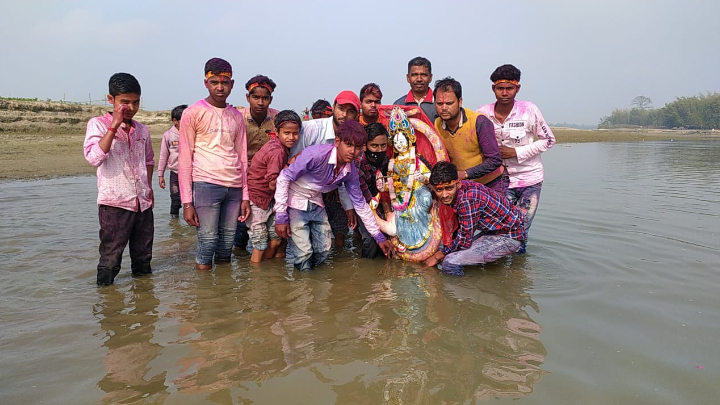 दोपहर से ही प्रखंड मुख्यालय के अलावा ग्रामीण क्षेत्रों में विसर्जन की शोभायात्रा शुरू हो गई थी। यह सिलसिला कई घटों तक चला। प्रतिमा विसर्जन शोभायात्रा विभिन्न सड़कों से गुजरती रही। विभिन्न पूजा पंडालों द्वारा अलग-अलग निकाली गई विसर्जन शोभायात्रा में शामिल विद्यार्थी व अन्य लोग साउंड सिस्टम की धुन पर नाचते-थिरकते और एक दूसरे को अबीर-गुलाल लगाते चल रहे थे।