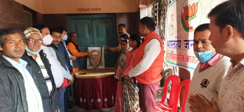 भारतीय जनता पार्टी फारबिसगंज नगर द्वारा आयोजित पंडित दीनदयाल जी उपाध्याय की पुण्यतिथि के अवसर पर समर्पण दिवस का आयोजन स्थानीय मारवाड़ी अतिथि सदन फारबिसगंज में की गई। जिसमें मुख्य अतिथि के रुप में स्थानीय विधायक विद्यासागर केसरी जी, पूर्व जिला अध्यक्ष मनोज झा जी उपस्थित हुए इस कार्यक्रम को फारबिसगंज नगर के सभी बूथों पर आयोजित की गई एवं समर्पण दिवस के अवसर पर माइक्रो डोनेशन के द्वारा पार्टी कोष में समर्पण करने के लिए आम जनों को प्रेरित किया गया।