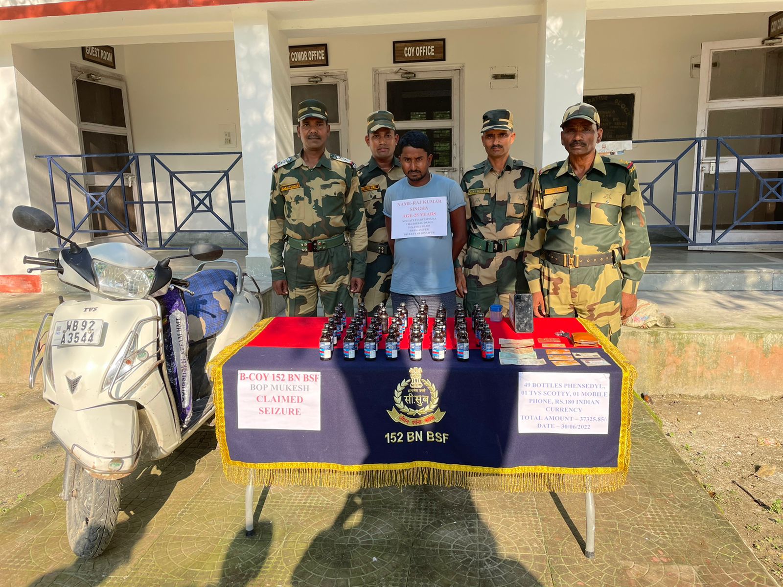 भारत-बांग्लादेश सीमा की सुरक्षा में तैनात बीएसएफ जवानों ने फैंसीड्रिल की खेप के साथ एक भारतीय तस्कर को गिरफ्तार किया है। मुकेश बीओपी पर तैनात 152 वीं बटालियन के जवानों ने उत्तर दिनाजपुर जिले के ग्वालपोखर थाना क्षेत्र स्थित सीमावर्ती इलाके से तस्कर को उस वक्त गिरफ्तार किया गया ।