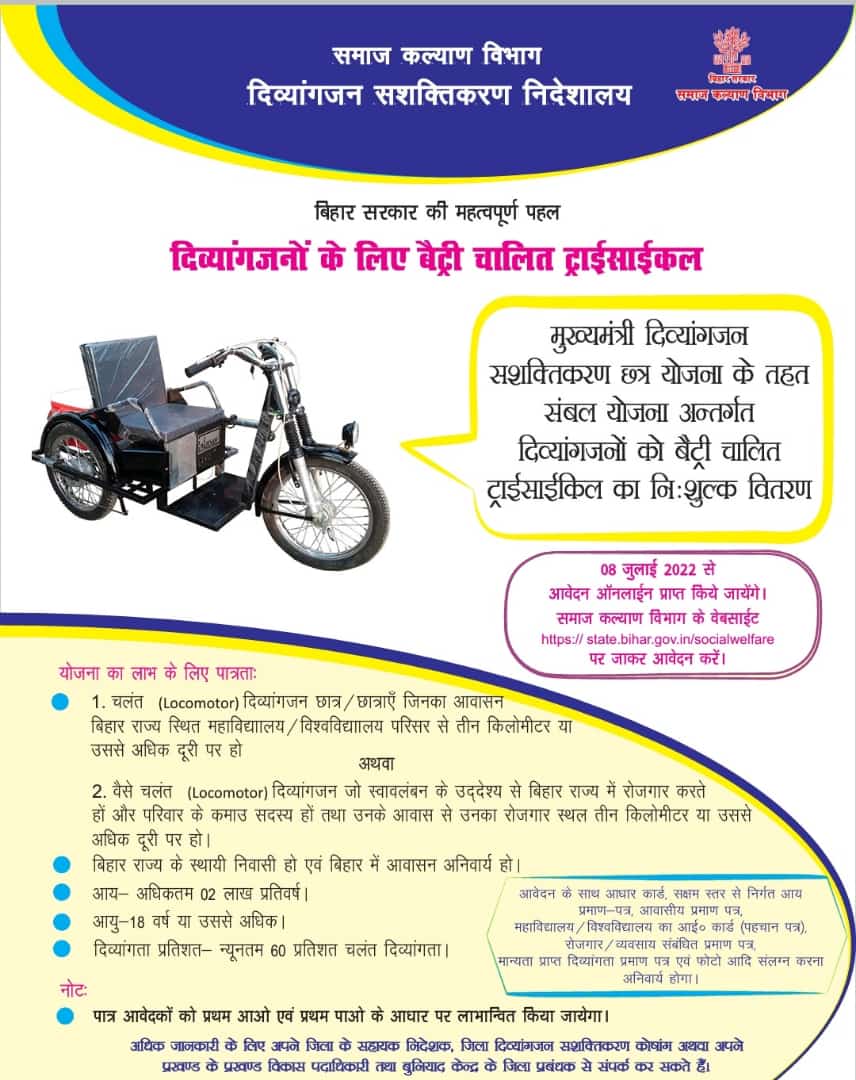 मुख्यमंत्री दिव्यांगजन सशक्तिकरण छात्र योजना के संबल योजना अंतर्गत दिव्यांग जनों को बैटरी चालित ट्राई साइकिल का निशुल्क वितरण किया जाना है। इसको लेकर विभागीय स्तर से दिव्यांग जनों व उनके संबंधियों को 8 जुलाई 2022 से विभागीय वेबसाइट https://state.bihar.gov.in/social welfare पर आवेदन ऑनलाइन करना है। आवेदन के साथ आधार कार्ड, सक्षम स्तर से निर्गत आय प्रमाण पत्र, आवासीय प्रमाण पत्र, महाविद्यालय/विश्वविद्यालय का आईडी कार्ड, रोजगार/व्यवसाय संबंधित प्रमाण पत्र, मान्यता प्राप्त दिव्यांग का प्रमाण पत्र एवं फोटो आदि संलग्न करना अनिवार्य होगा।