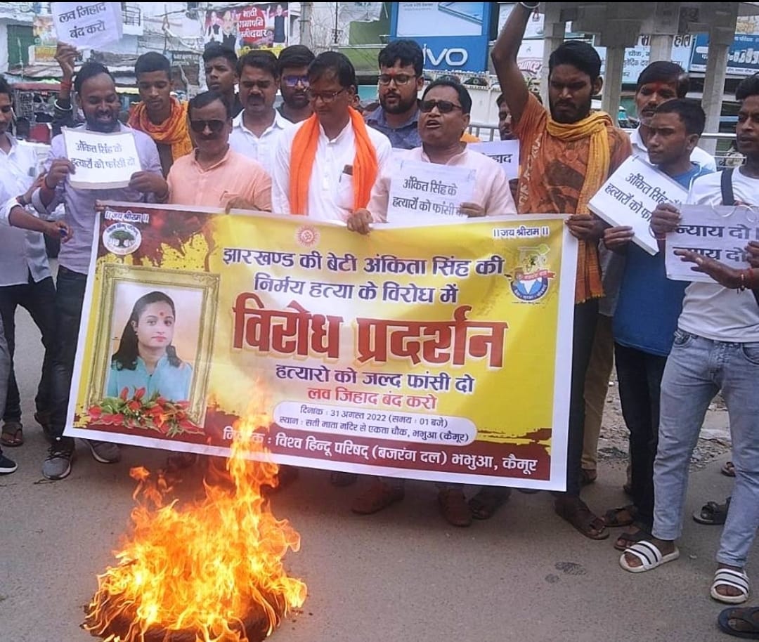 बुधवार को विश्व हिंदू परिषद बजरंग दल के तत्वाधान में झारखंड की बेटी अंकिता सिंह की निर्मम हत्या के खिलाफ भभुआ शहर में टायर जलाकर विरोध प्रदर्शन किया गया। प्रदर्शन का नेतृत्व विश्व हिंदू परिषद के नगर अध्यक्ष अमित कुमार ट्विंकल एवं बजरंग दल के जिला सह संयोजक प्रिंस सिंह ने किया। प्रदर्शन में शामिल लोग अंकिता को न्याय दो, अंकिता के हत्यारे को फांसी दो, लव जिहाद पर रोक लगाओ, इत्यादि नारे लगा रहे थे।