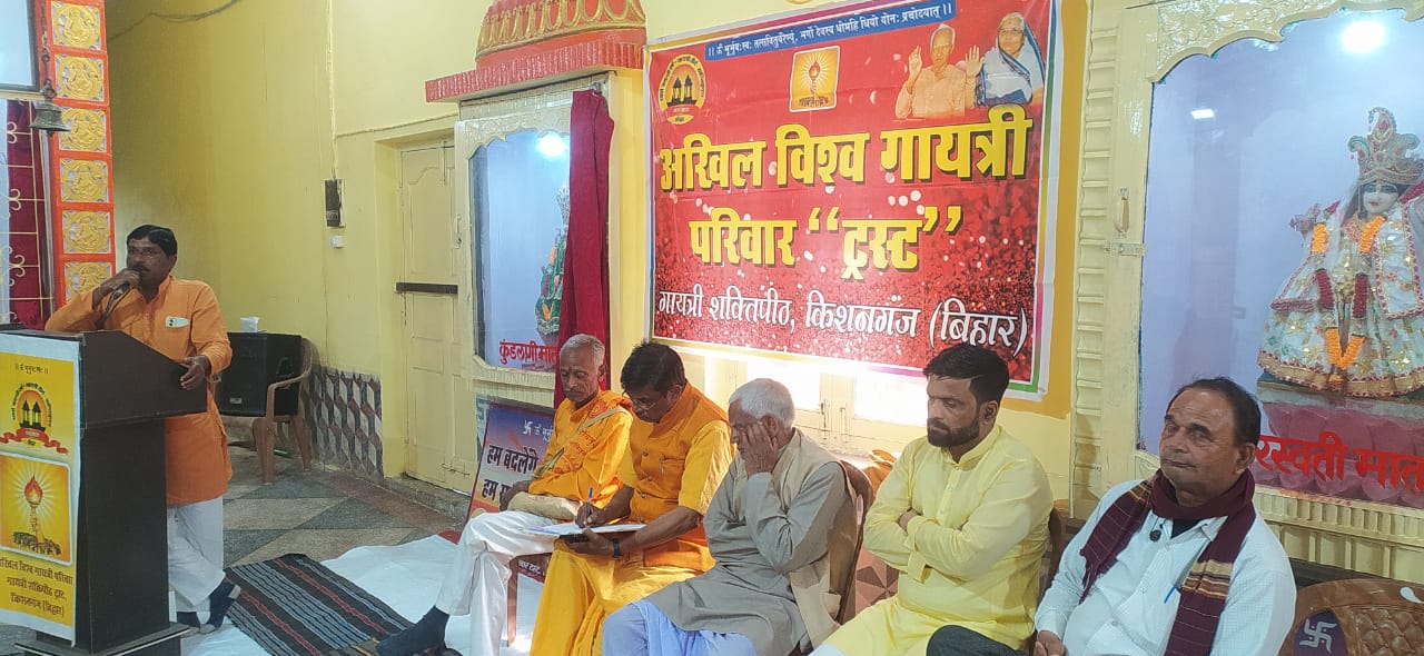 बैठक में कार्यकर्ताओं की सामूहिक परिचर्चा शान्तिकुंज हरिद्वार के तत्वावधान में आयोजित जिला स्तरीय कार्य पर विचार विमर्श हेतु एक गोष्ठी का आयोजन किया गया था । जिसमें मार्च में होने वाले गायत्री महायज्ञ जो कि टेढ़ागाछ ओर दिघलबैंक प्रखंड में दिव्यता ओर भव्यता के साथ होने वाला है । इस संदर्भ में ट्रस्टी मिक़्क़ी साह ने संबोधित कर गायत्री परिवार के उद्देश्यों पर प्रकाश डाल कर सक्रियता से कार्य करने की बात कही। परम पूज्य गुरुदेव के विचारों को जन जन तक पहुंचाने का दायित्व हम सक्रिय रूप से करें ! शांतिकुंज, पं. श्रीराम शर्मा आचार्य की तपस्थली है। शांतिकुंज का सनातन संस्कृति को विस्तार देने में महत्वपूर्ण योगदान रहा है। गायत्री परिवार का सामाजिक सांस्कृतिक और आध्यात्मिक उत्थान में अहम योगदान रहा है। जिले में कई कार्यक्रम गायत्री परिवार ट्रस्ट के सहयोग से संचालित हो रहा है । जिसमे गायत्री परिवार के परिजनों की सक्रिय भूमिका होती है । जिले में कोई भी कार्यक्रम की जानकारी प्रखंड व जिला संयोजक की अनुमति जरूरी है । ओर जिला ट्रस्ट की रशीद पर ही कार्यक्रम की अनुमति होगी ।