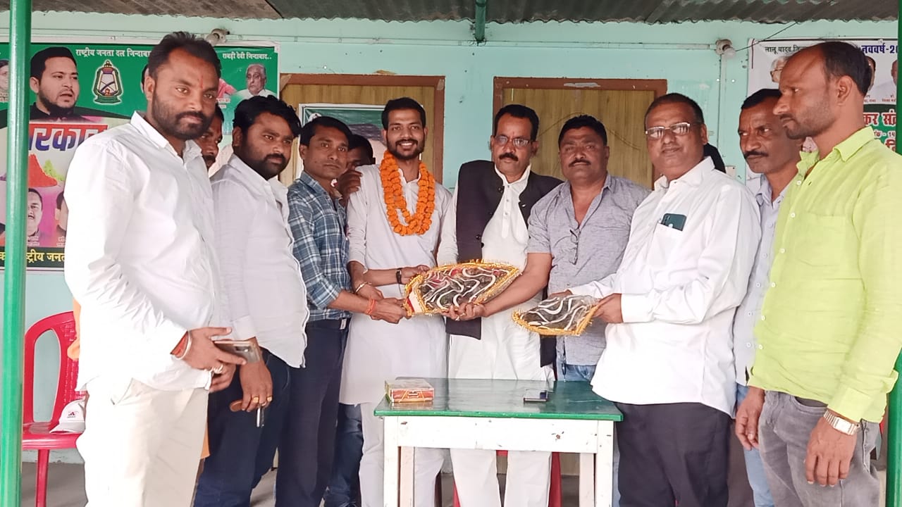 राष्ट्रीय जनता दल व्यवसायिक प्रकोष्ठ के प्रदेश अध्यक्ष सह मौरवा विधायक रनविजय साहू के हाथों राजद की सदस्यता लिए फारबिसगंज निवासी व सामाजिक कार्यकर्ता आयुष अग्रवाल को सदस्यता उपरांत व्यवसायिक प्रकोष्ठ का प्रदेश महासचिव बनाया गया, इसी खुशी में राजद जिला अध्यक्ष सुरेश पासवान के अध्यक्षता में कई पदाधिकारियों के साथ राजद कार्यालय फारबिसगंज में आयुष अग्रवाल का फूल माला पहनाकर और बुके दे कर स्वागत किया गया।