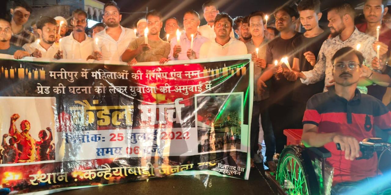 सामाजिक कार्यकर्ता मु राजा के नेतृत्व में निकाली गई कैंडल मार्च जनता चौक से कन्हैयाबाड़ी मुख्य चौराहे तक पहुंच कर संपन्न हो गया।इस दौरान लोगों ने केंद्र एवं मणिपुर सरकार से दोषियों को कड़ी से कड़ी सजा देने की मांग किया। इस अवसर पर मु राजा, गुफरान आलम फौजी,मेराज अनिस, इमरान आलम, साहब बाबू, मोअज्जम रजा,मु आरजू, सज्जाद आलम, नियामत राही,साहिल आलम इत्यादि मौजूद थे।