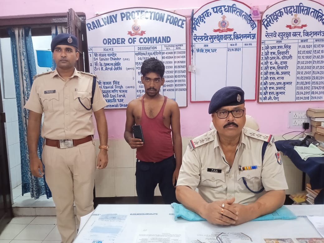 आरपीएफ जवानों ने एक मोबाइल चोर को गिरफ्तार किया है। किशनगंज रेलवेस्टेशन के प्लेटफार्म नंबर एक पर गस्त कर रहे जवानों ने चलती कटिहार सिलीगुड़ी इंटरसिटी एक्सप्रेस से एक युवक को उतर कर भागते देखा। जिसे जवानों ने पीछा कर दबोच लिया।