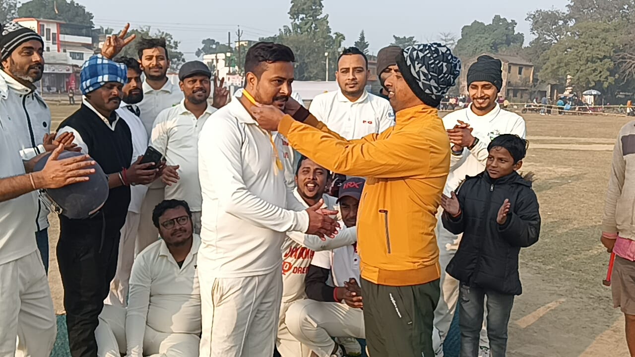 मैन ऑफ द मैच दुर्गेश तिवारी को अधिवक्ता शशि भूषण दुबे ने मेडल पहना कर सम्मानित किया ।आज के अंपायर आकाश झा एंव नवजेश थे।जनल्बकी स्कोरर गौरव कुमार थे।
