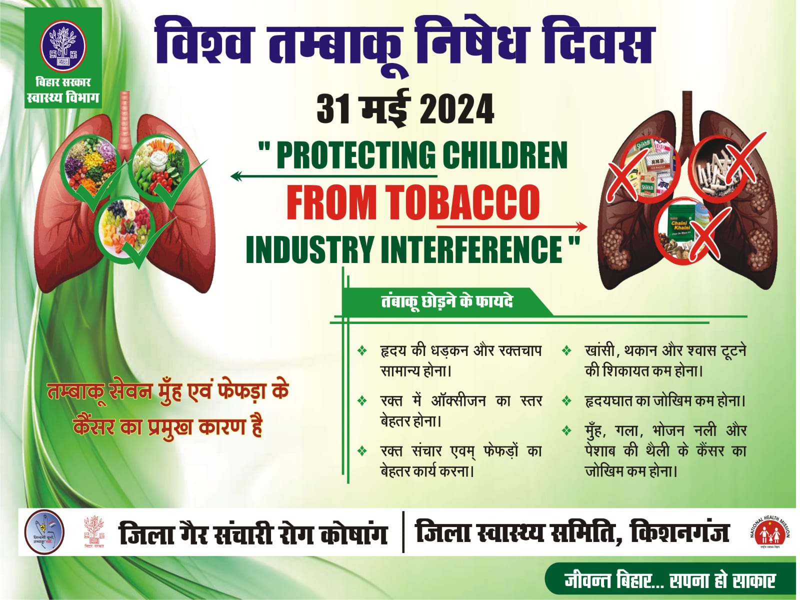 बताते चलें कि विश्व तम्बाकू निषेध दिवस की शुरुआत डब्ल्यूएचओ द्वारा 1987 में की गयी थी। इस दिन का उद्देश्य तंबाकू सेवन के व्यापक प्रसार और नकारात्मक स्वास्थ्य प्रभावों की ओर ध्यान आकर्षित करना है, जो वर्तमान में दुनिया भर में हर साल 70 लाख से अधिक मौतों का कारण बनता है। विश्व तंबाकू निषेध दिवस 2024 की थीम ‘बच्चों को तंबाकू उद्योग के हस्तक्षेप से बचाना’ है. यह थीम उन नीतियों और उपायों की वकालत करने पर केंद्रित है जो तंबाकू उद्योग को हानिकारक तंबाकू उत्पादों के साथ युवाओं को लक्षित करने से रोकते हैं की थीम पर जिले के सभी स्वास्थ्य संस्थानों में मनाया जायेगा |