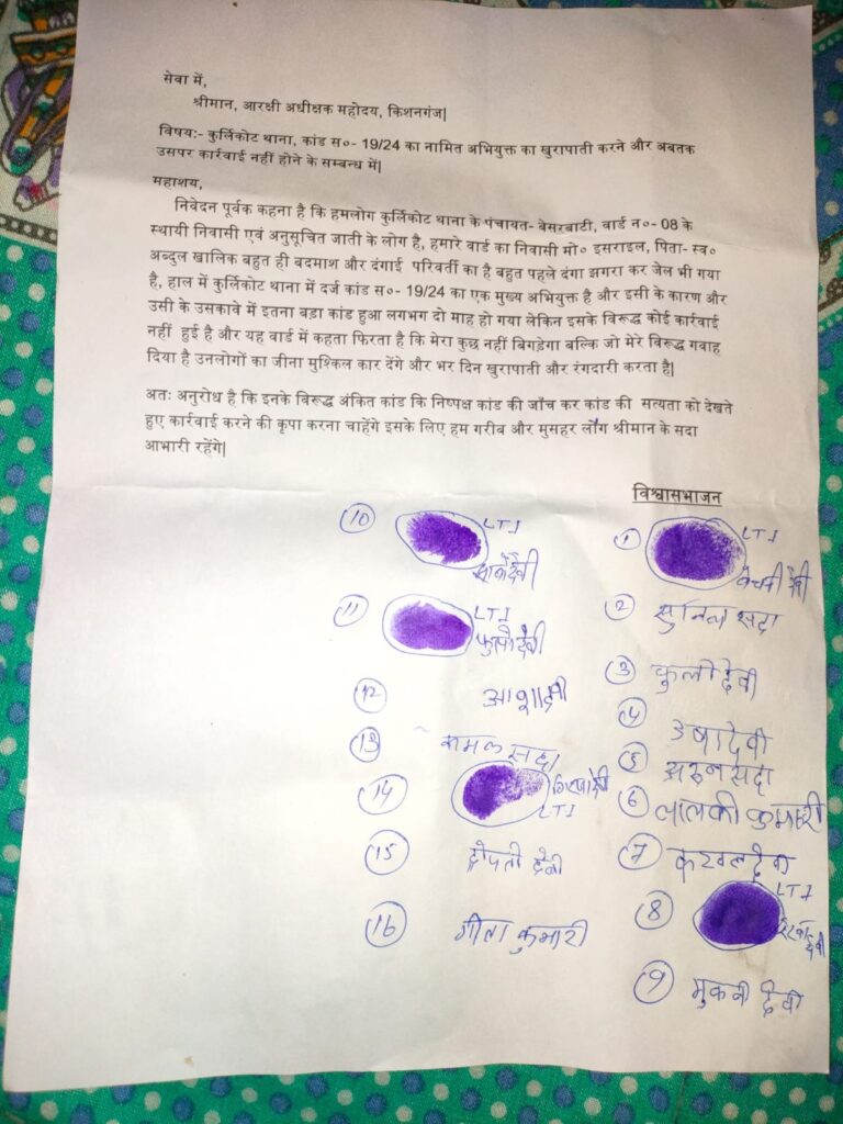 ग्रामीणों ने कहा की हम सभी अनुसूचित जाति के लोग है और इसराइल हमेशा झगड़ा लड़ाई करता रहता है और कुर्लिकोट थाना कांड संख्या 19/24 में यह आरोपी है। लेकिन घटना के दो महीने बाद भी इसकी गिरफ्तारी नहीं हुई है ।उप मुखिया रंजन कुमार ने कहा की कांड का जांच कर सत्यता को देखते हुए इसे गिरफ्तार किया जाना चाहिए ताकि हम लोग अमन चैन से रह सके ।आवेदन देने वालो में द्रोपदी देवी,उषा देवी,कमल सदा,गीता कुमारी सहित अन्य दर्जनों लोग शामिल है।