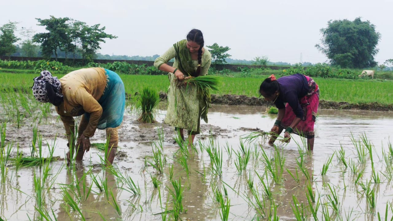 तब सुनहरा खेतोत, अन्नदाता रोपा रोपछे।