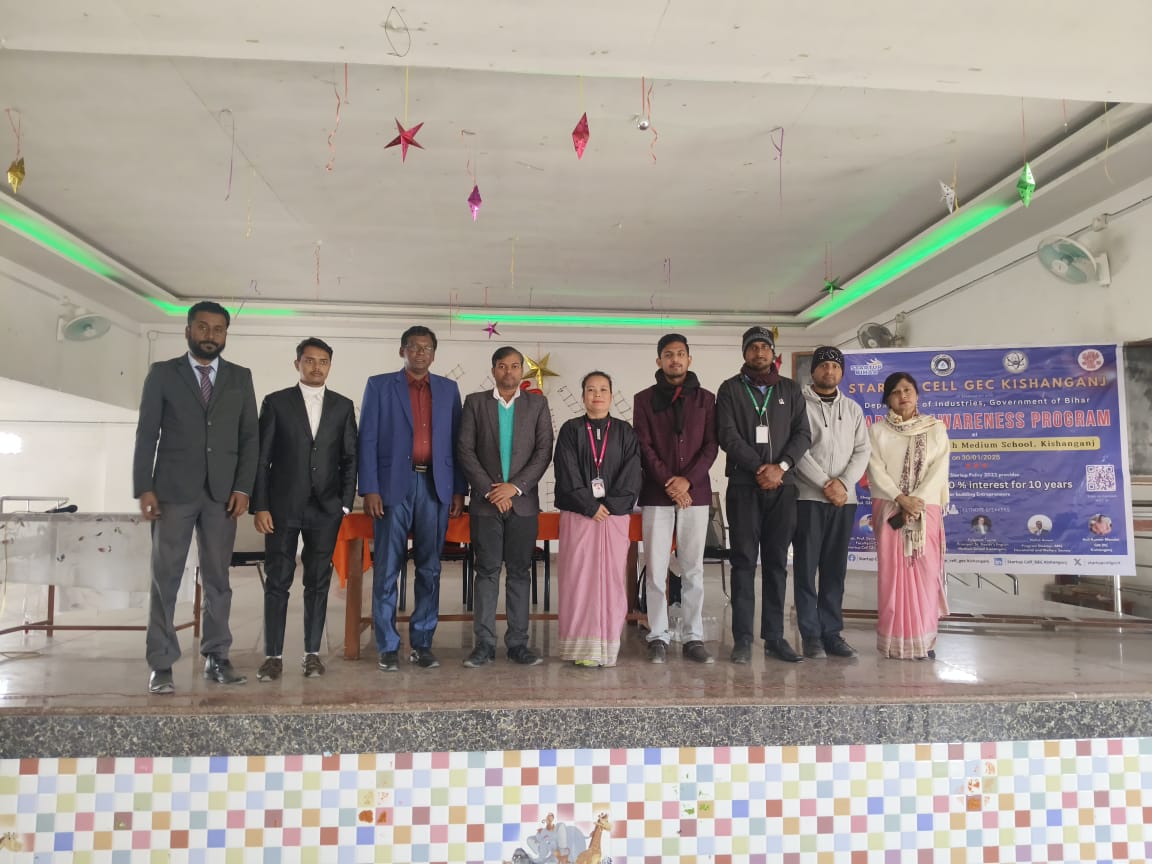 स्टार्टअप सेल, जीईसी किशनगंज उद्योग विभाग बिहार सरकार द्वारा सेंट जेवियर्स इंग्लिश मीडियम स्कूल में स्टार्टअप जागरूकता कार्यक्रम का आयोजन किया गया। यह कार्यक्रम बिहार सरकार के उद्योग विभाग के तत्वावधान में संपन्न हुआ, जिसका उद्देश्य छात्रों को उद्यमिता (एंटरप्रेन्योरशिप) और नवाचार (इनोवेशन) के प्रति जागरूक करना था। जिसमें बिहार सरकार द्वारा 10 लाख का लोन 10 साल के लिए वह भी बिना किसी ब्याज के दिये जाने की जानकारी दी गई ।
