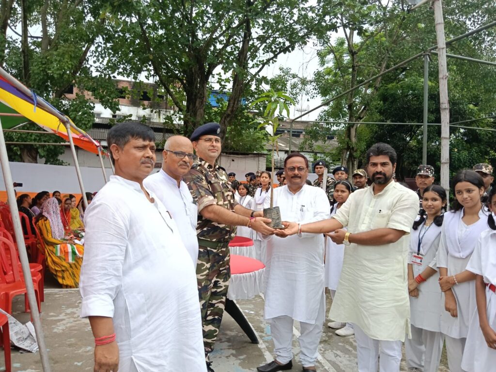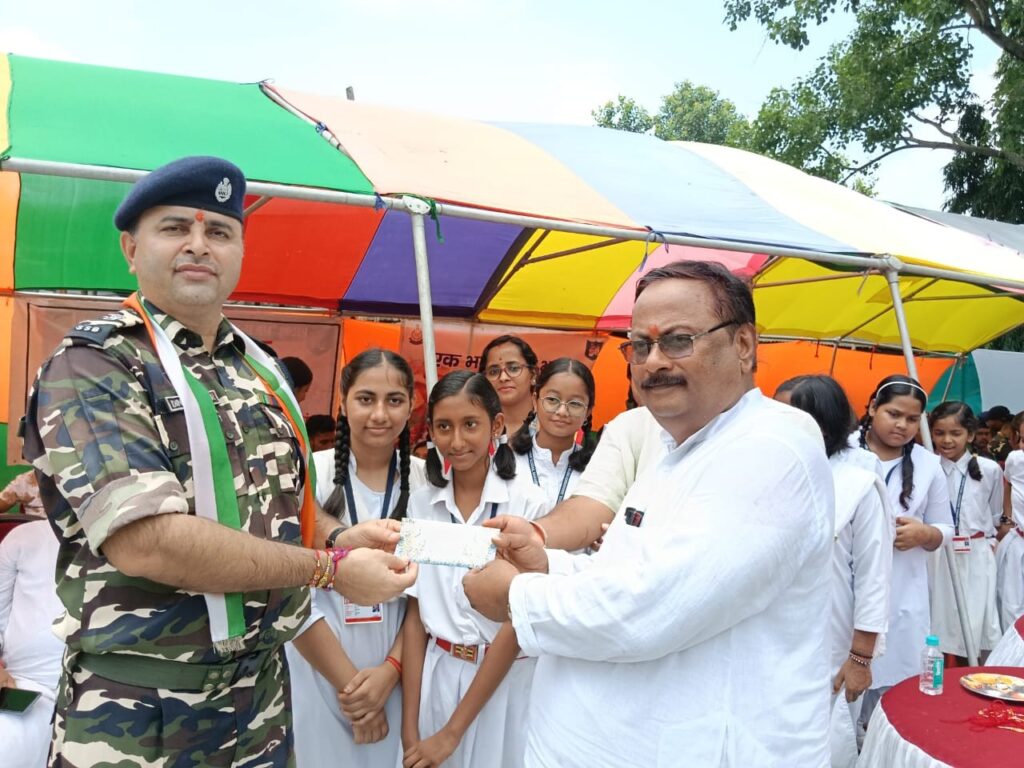 भैया बहनों के साथ विद्यालय के प्राचार्य नागेंद्र कुमार तिवारी, राष्ट्रीय स्वयंसेवक संघ के विभाग प्रचारक रौशन राणा तथा उप प्राचार्य संतोष कुमार ठाकुर ने एक आम का पौधा कमांडेंट को समर्पित किया।