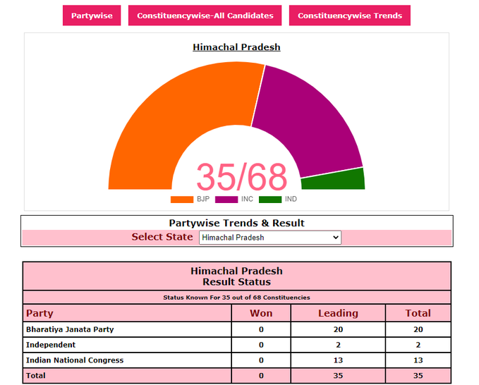 हिमाचल प्रदेश विधान सभा के वोटों की गिनती जारी ,सभी 68 सीटों के आए रुझान December 8, 2022 No Comments